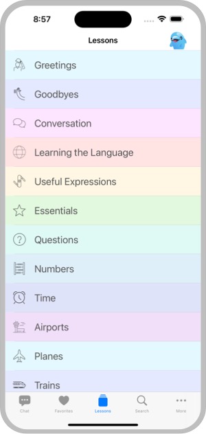 The Lessons Screen displays all the lessons available as buttons in two columns when you first start the app. There are over a hundred lesson on useful topics like taking public transportation or checking in to a hotel. There are engaging lessons such as making friends or flirting. And there are unexpected lessons such as pick-up lines and rejections.