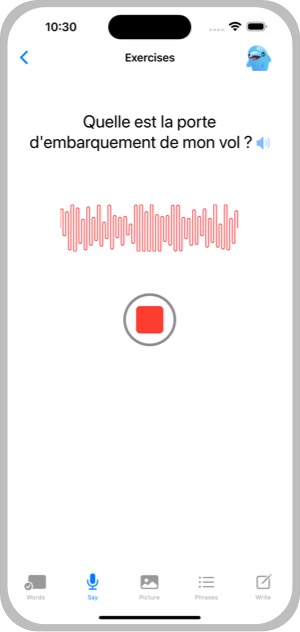 The Say Exercise can be found by selecting a Lesson from the Home Screen, tapping on the icon to the right of any phrase pair (arrow in a circle) then tapping on the Say icon at the bottom of the screen.